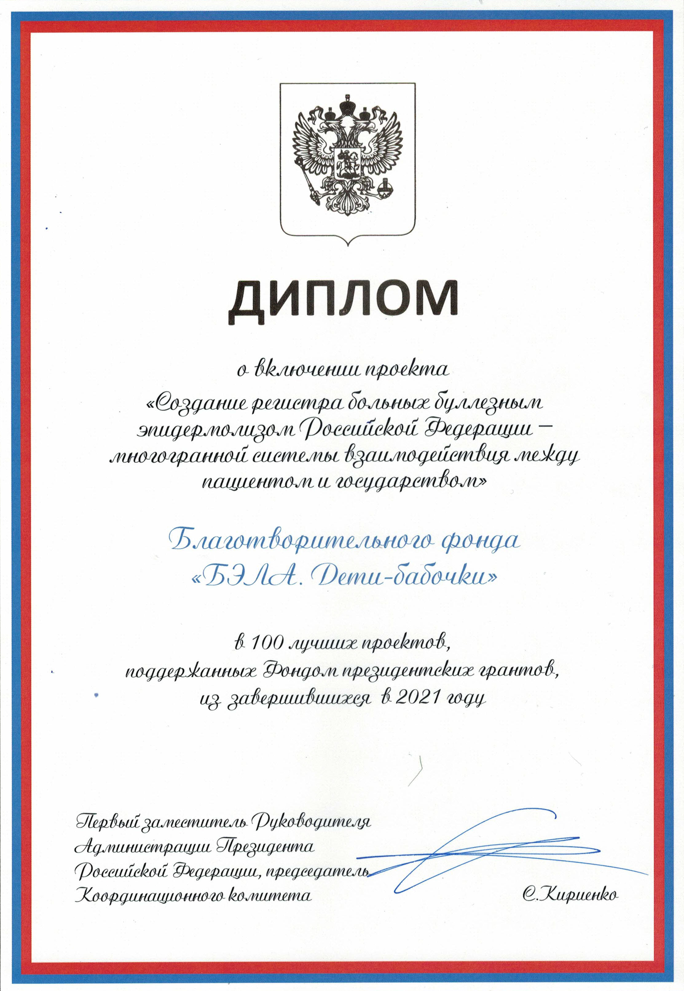 Диплом о включении РЕГИСТРА благотворительного фонда "Дети-бабочки" в 100 лучших проектов, поддержанных Фондом президентских грантов, из завершившихся в 2021 году
