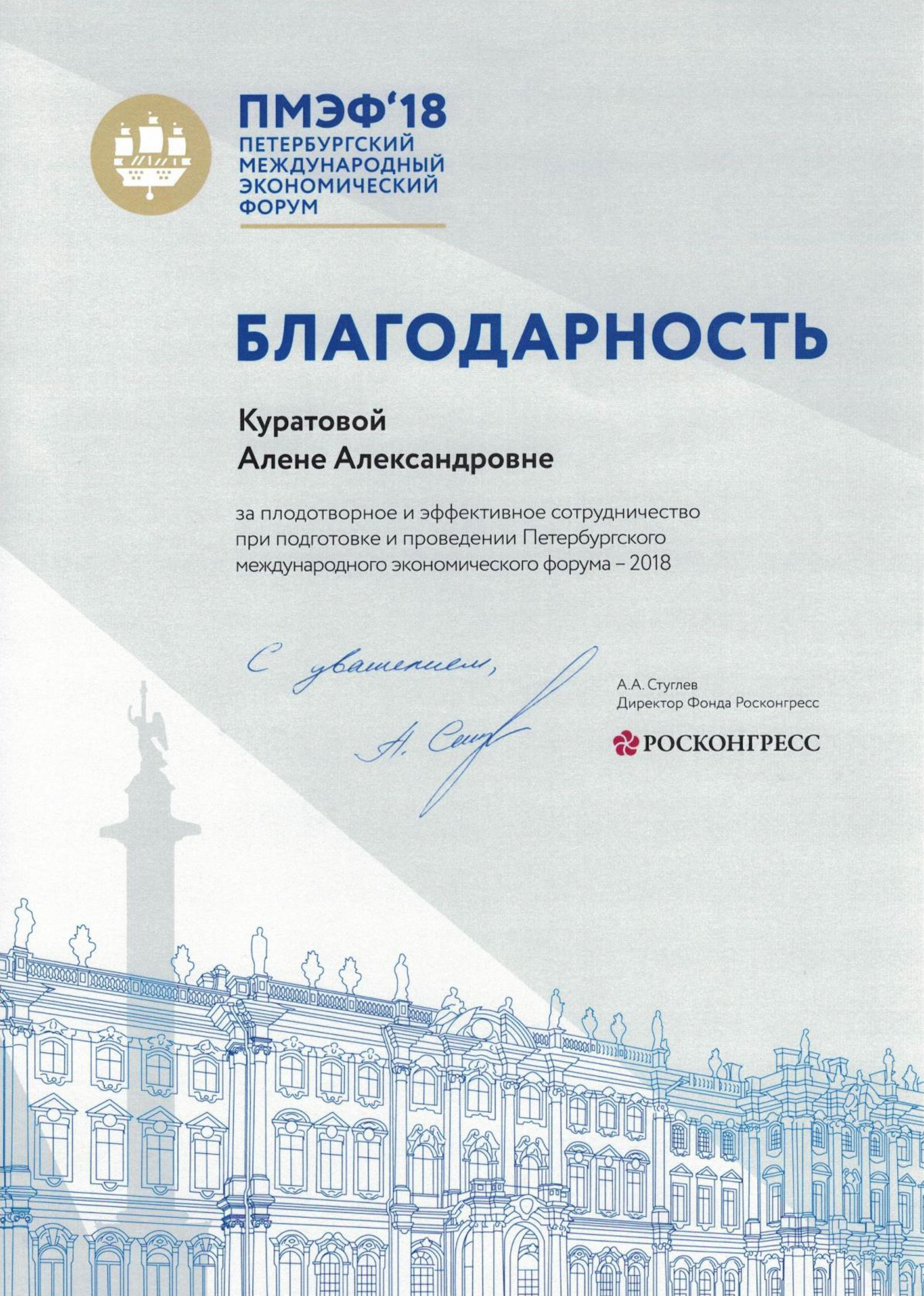 Благодарность Алёне Куратовой за плодотворное и эффективное сотрудничество при подготовке и проведении Петербургского международного экономического форума - 2018