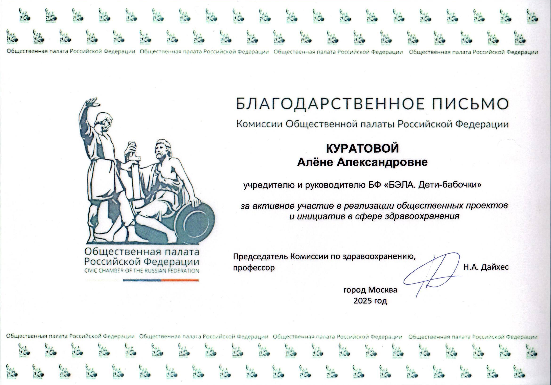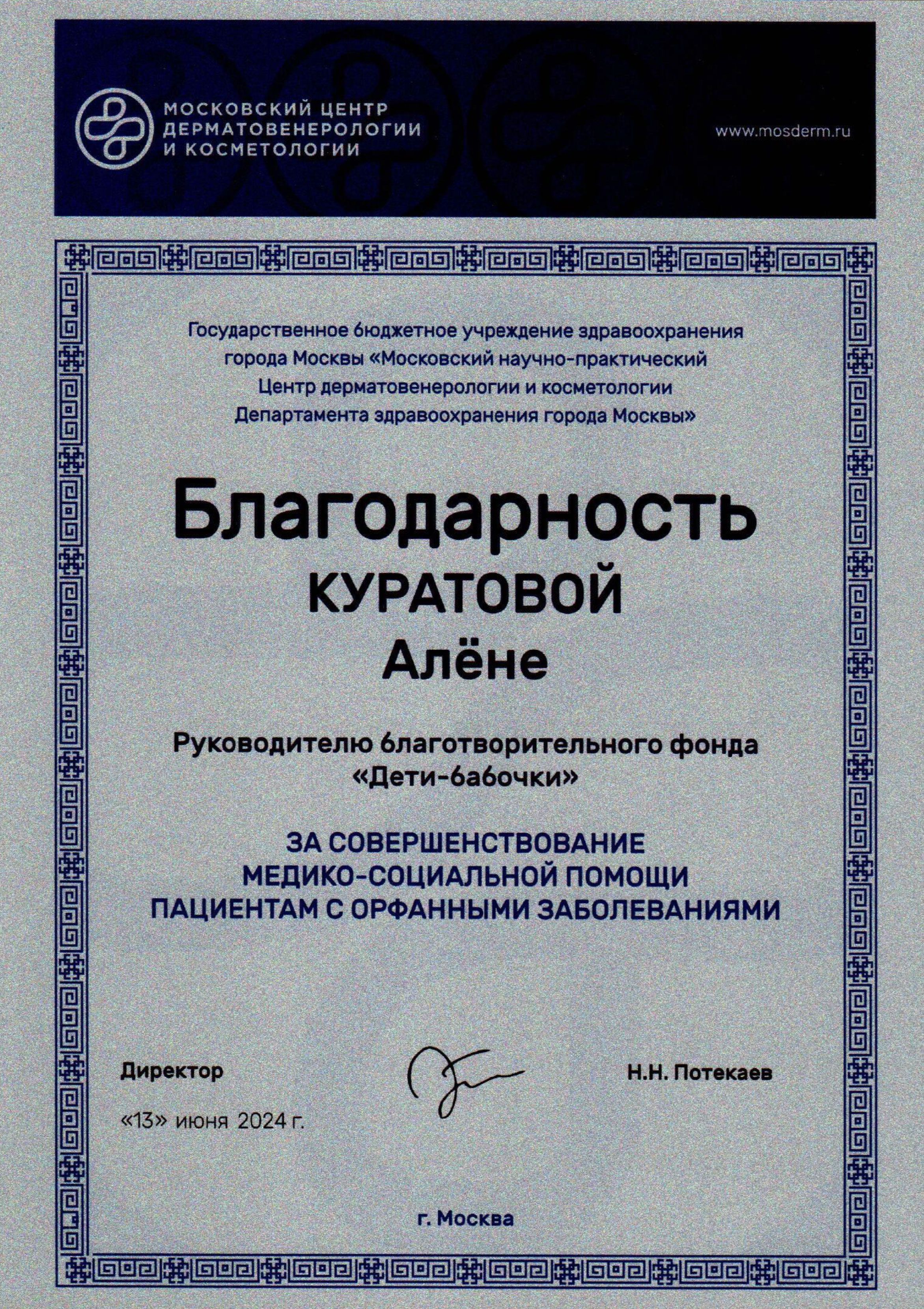 Почетная грамота Алены Куратовой за чуткое отношение к проблемам детей с буллезным эпидермолизом и в связи с празднованием Дня медицинского работника.