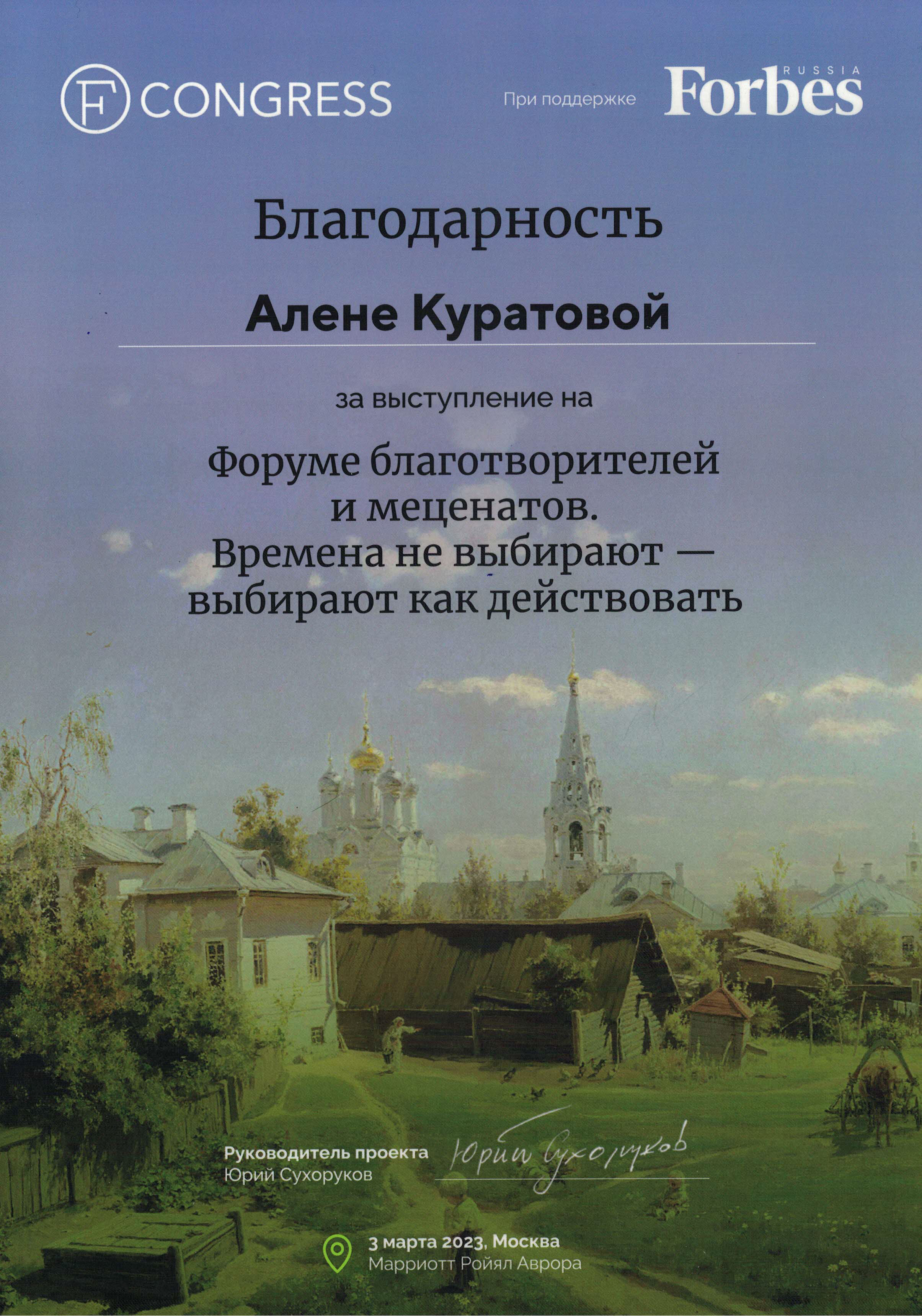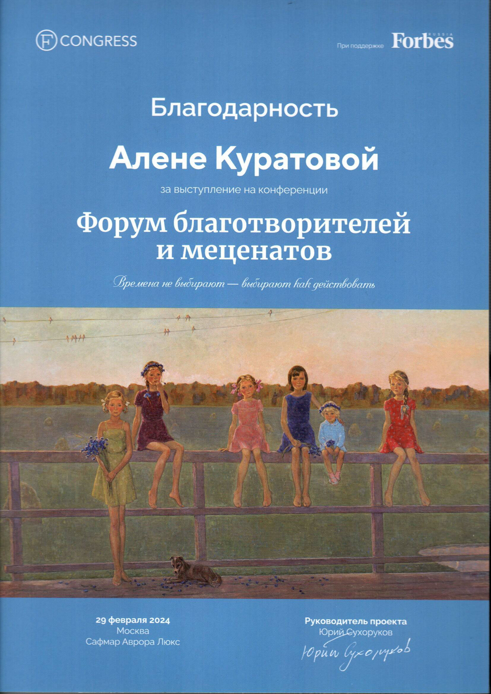 Благодарность Алёне Куратовой за выступление на Форуме Благотворителей и меценатов "Времена не выбирают - выбирают как действовать"