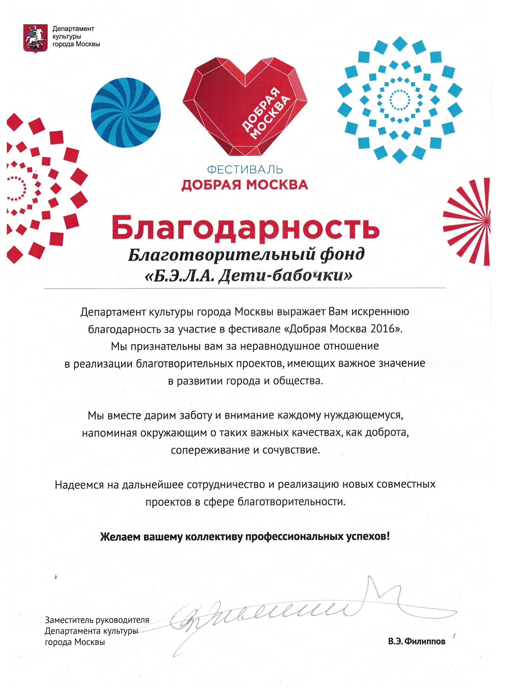 Благодарность от Департамента культуры города Москвы за неравнодушное отношение в реализации благотворительных проектов