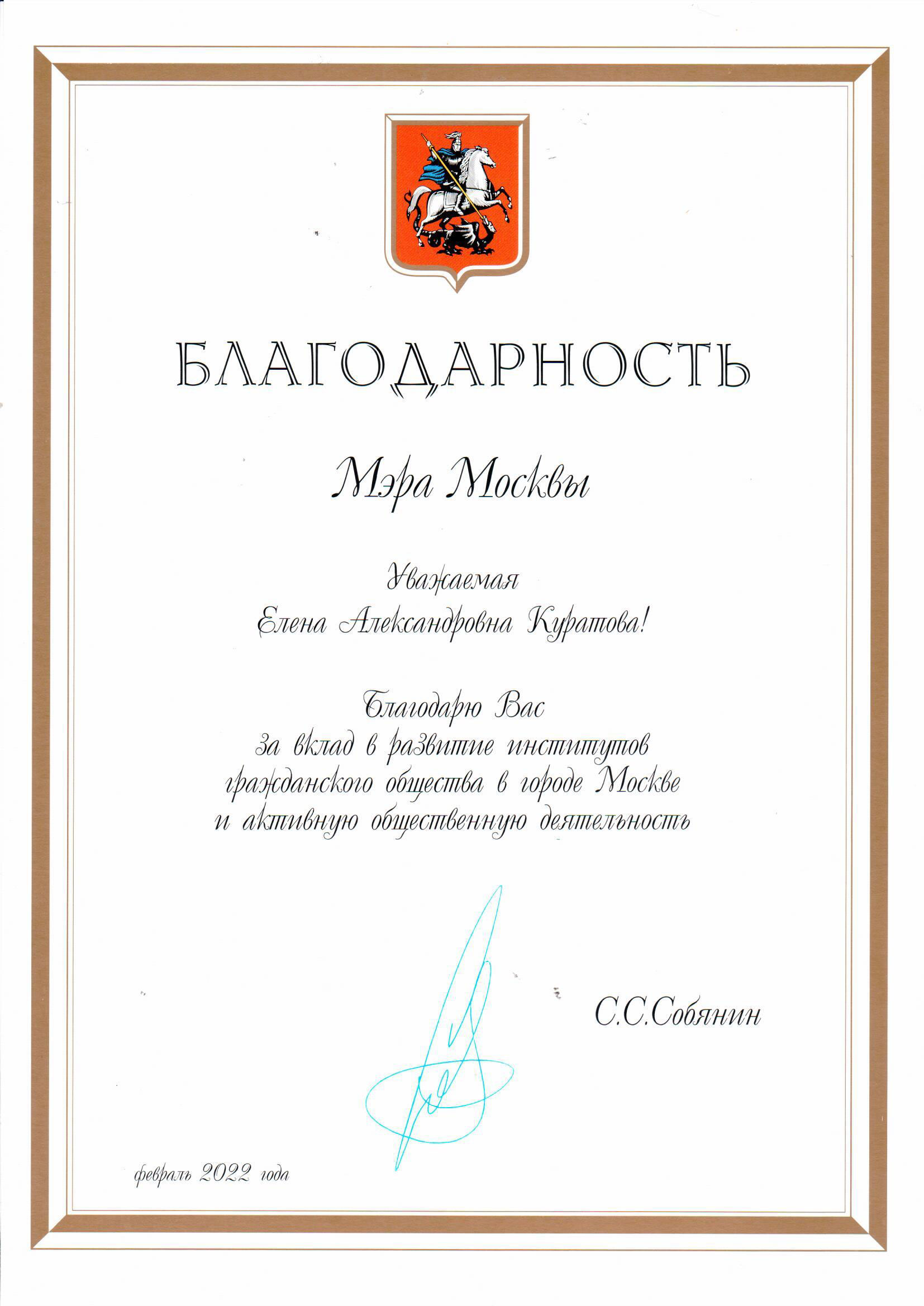 Багодарность Алёне Куратовой от мэра Москвы за вклад в развитие институтов гражданского общества в городе Москве и активную общественную деятельность