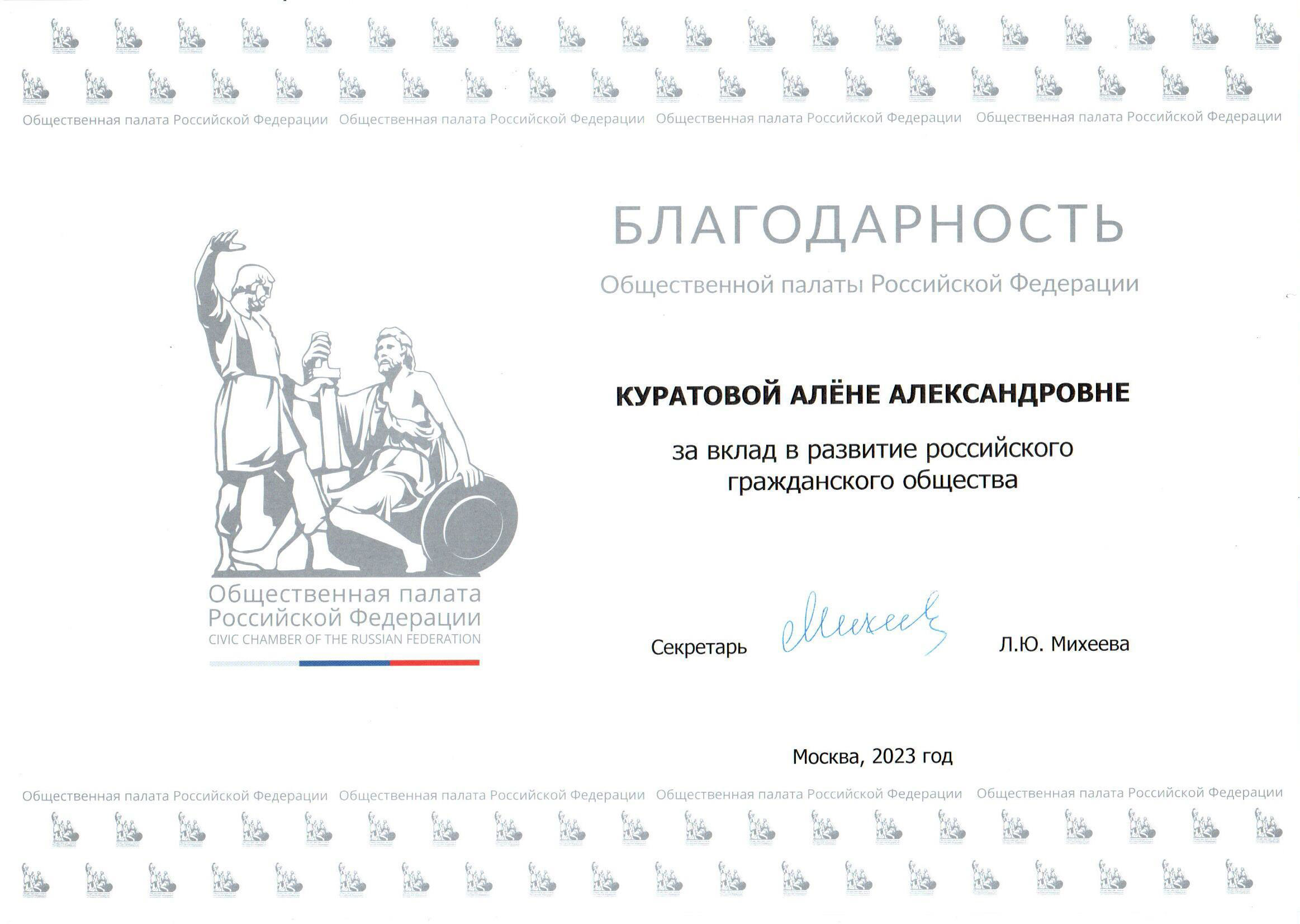 Благодарность Алёне Куратовой за вклад в развитие российского гражданского общества