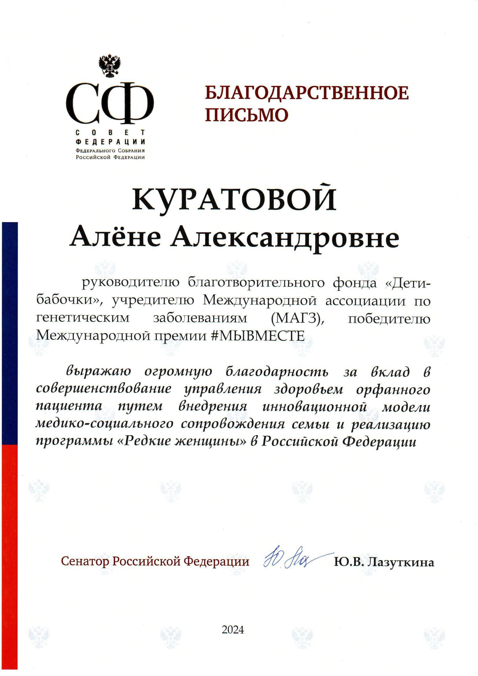Благорадность Алёне Куратовой за вклад в совершенствование управления здоровьем орфанного пациента путем внедрения инновационной модели медико-социального сопровождения семьи и реализацию программы "Редкие женщины" в Российской Федерации