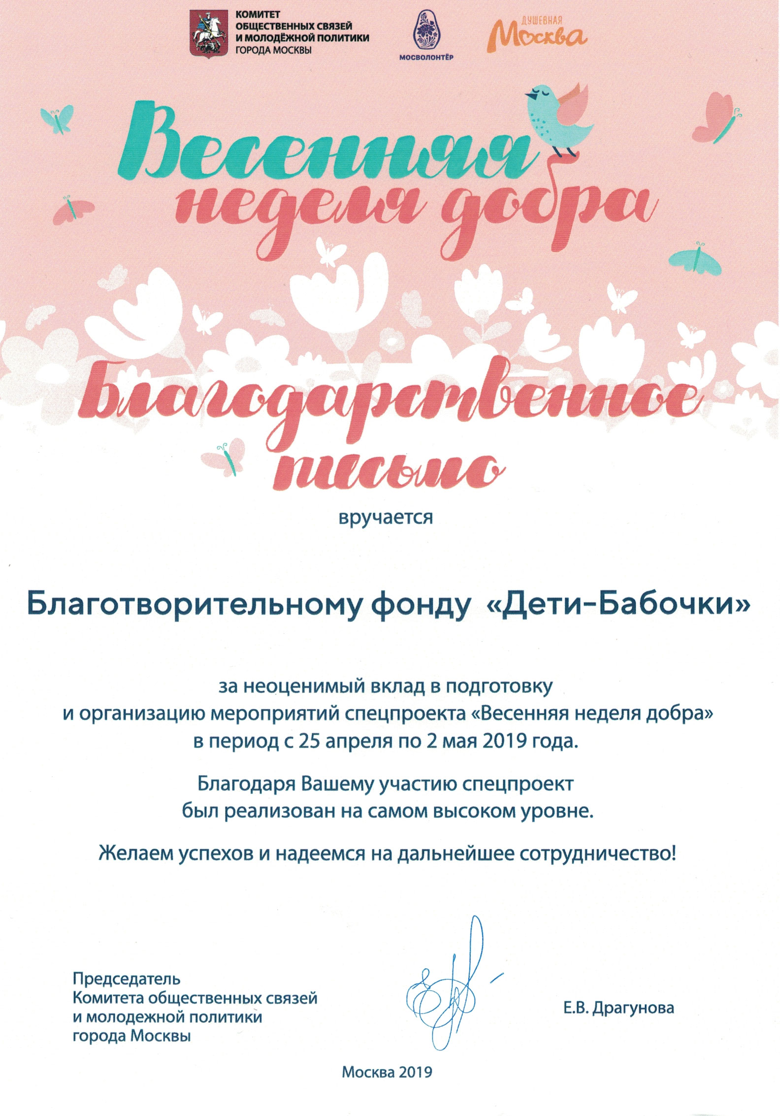 Благодарность от КОС за неоценимы вклад в подготовку и организацию мероприятий спецпроекта "Весенняя неделя добра"