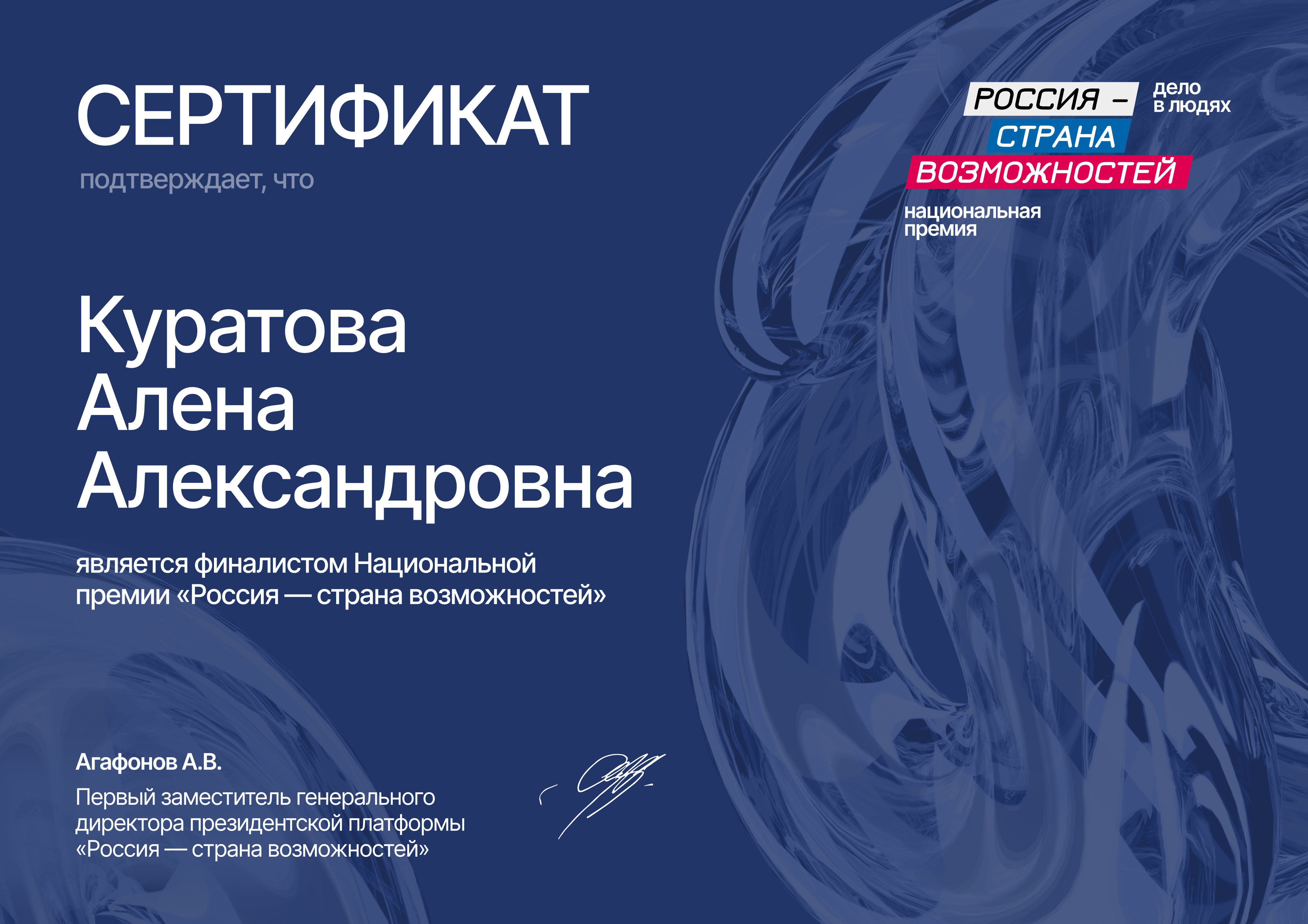 Сертификат, подтверждающий что Алёна Куратова является финалистом Национальной премии "Россия - страна возможностей"